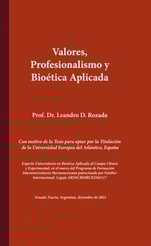 Valores, profesionalismo y bioética aplicada es un trabajo que traslada al lector, la que fuera su tesis para alcanzar la titulación de Experto en bioética aplicada al ámbito clinico y experimentación por la Universidad Europea del Atlántico, España.