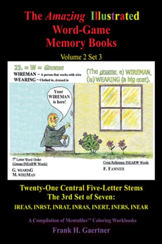 This book, Volume 2, Set 3 (V2S3) of The Amazing Illustrated Word Game Memory Books (The AIWGMB), completes stories and illustrations that have the ability to lock into ones photographic memory 2778 of the seven-letter words most likely to show up in the social-network, crossword games.